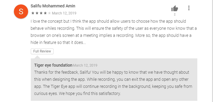 Once the recording is over, you can locate your recorded video in the app menu and then you decide whether to “share” to your social media platform or forward it to the “tiger eye team” or any journalist within your community.