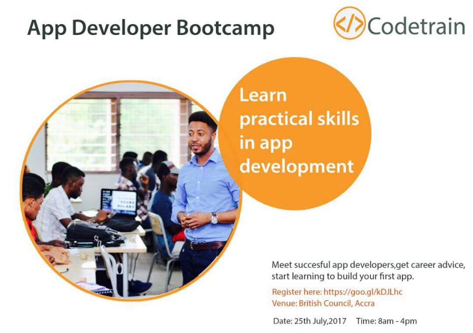 Codetrain is organising the Codetrain App Developer Bootcamp (CADB) in July 2017 at the British Council, Accra – Ghana.