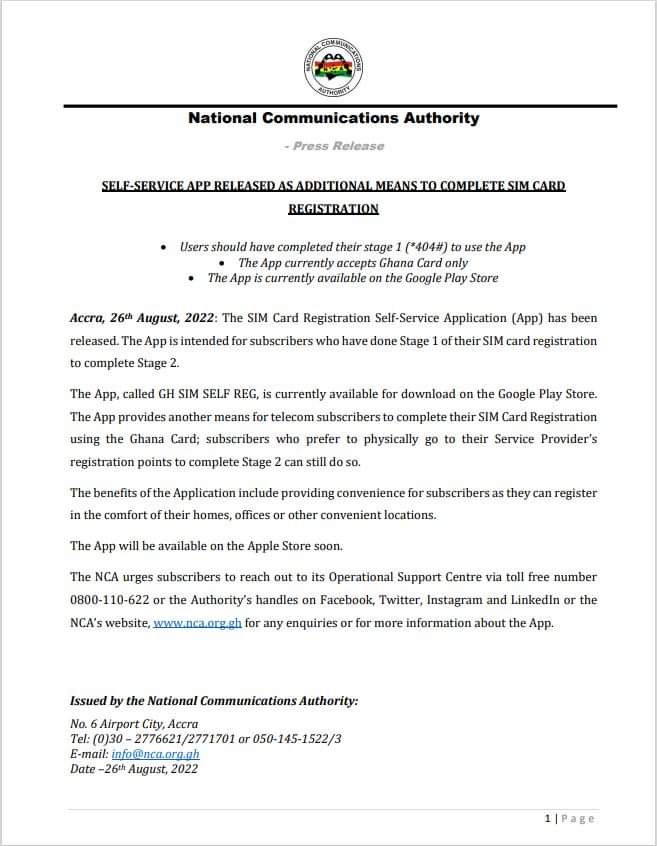 The National Communication Authority (NCA) in a press release on August 26th, 2021 announced to Ghanaians the release of the “SIM Card Registration Self Service App”.