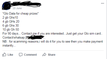 This one readily comes to memory as I write this post, particularly because I am a “Big Glo Customer” and the emergence of this so-called free browsing trick affected me negatively. My first experience with this promise of cheap and almost free data was in June 2017 on Facebook. I was sharing posts onto facebook groups when I chanced upon a message encouraging people to pay for Glo data at ridiculously low prices.