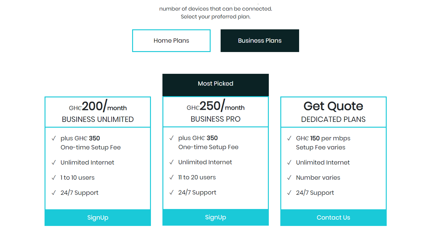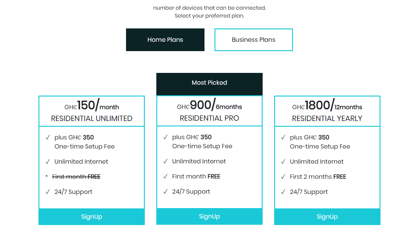 Each of these plans also comes with a sub-package that you can choose to subscribe. With the lowest home plan being GHS 150 per month with unlimited internet connectivity.