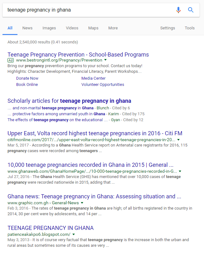 First, let us do a generic search (a search without any operator) so we look at the results without any operator. I would go with the term: Teenage pregnancy in Ghana (don’t ask me why!).
