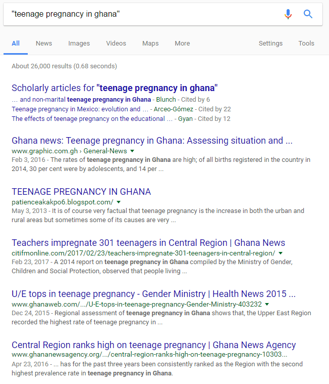 The difference between this and the first result is that it searches for the exact phrase “teenage pregnancy in Ghana” in the exact same order you typed it. The quotation marks or “search terms” helps you remove any irrelevant results from the search engines.