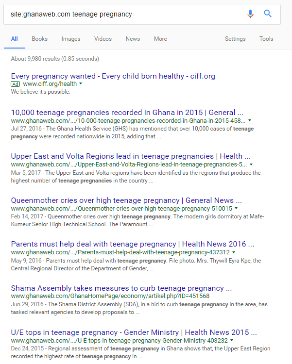 This one is very easy to use. Just put the domain name immediately after the colon. It is especially useful if you want articles on a subject from a particular site. Let’s say I want to search for articles relating to teenage pregnancy on Ghanaweb.com