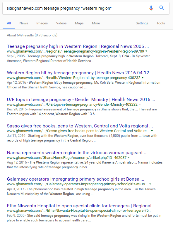We type exactly this in Google Search: site:ghanaweb.com teenage pregnancy “western region”. What this tells Google Search is to search only on the website ghanaweb.com for articles that contain teenage pregnancy, but the term “western region” should be present in the result in the same order.