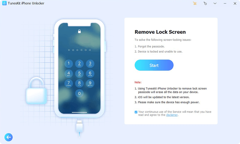 - The first thing is to install TunesKit iPhone Unlocker and then launch it. Next, Connect your iPhone via a USB cable. After that, press the “Start” icon.