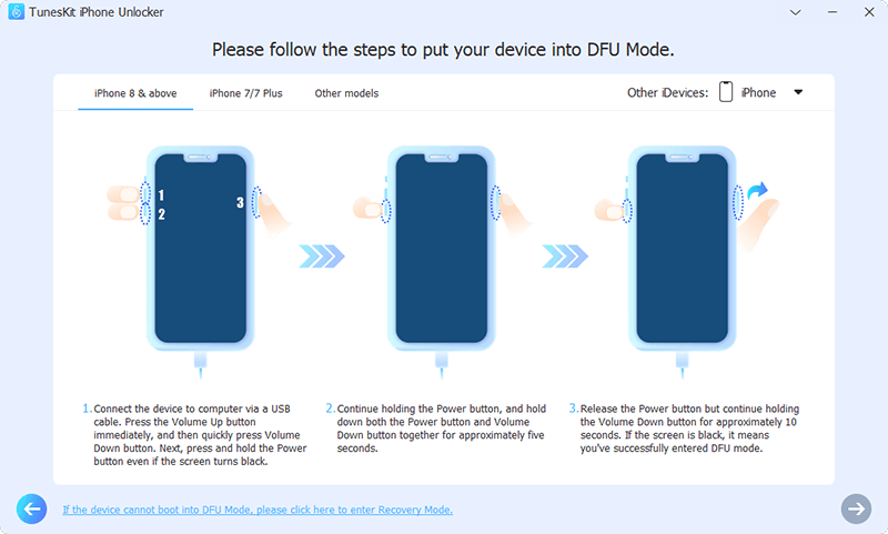 - Suppose your iPhone/iPad/iPod touch is not recognized. In that case, you will need to manually set it in DFU Mode or Recovery mode. You can set your device in DFU mode using the instructions in the TunesKit interface.