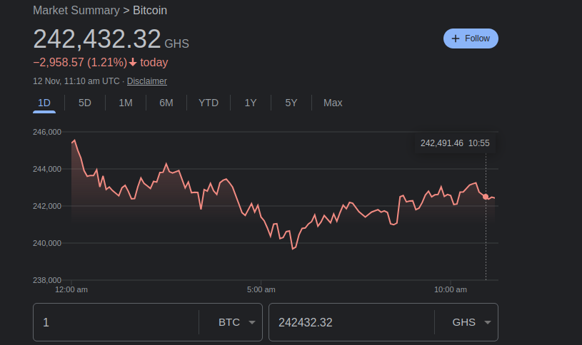 - Search for “BTC to Native currency” for example; “BTC to GHS” will give you the conversion calculator to determine the amount of BTC worth in GHS