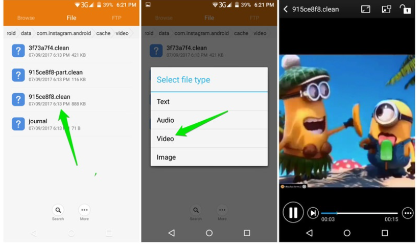 Then open the phone’s File manager and go to android > data > com. instagram. android > cache >videos. You will find all the watched videos and will have a .clean extension. You can click on any and select a video to play them.