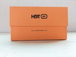 The Infinix Hot 6X is packaged in a colourful orange box with the visible Infinix branding.