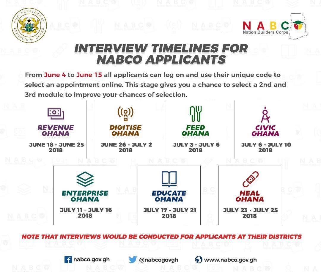 Online application: May 1, 2018, to June 1, 2018.District offices open for applicants to submit hard copies: June 4, 2018, to June 15, 2018Interviews: June 25, 2018, to July 7, 2018.NABCO District and Module Placement Orientation: July 16, 2018, to July 27, 2018.Placement and Commencement: August 1, 2018.