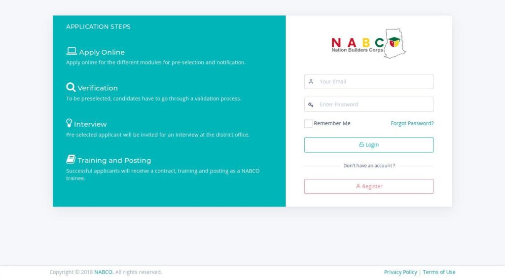 - Start by visiting apply.nabco.gov.gh