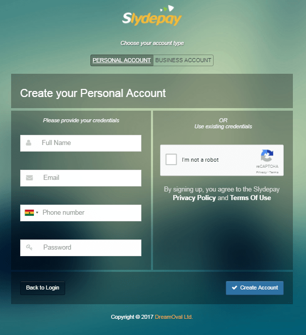 - Visit the Slydepay Sign Up page or download the app from your favourite app store.