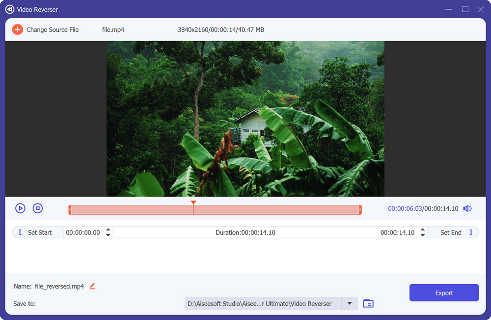 Step 3. Then you can select any part you want to reverse by dragging and moving the ends of the slider bar. Or, you can simply set the exact start or end time according to your need. Once you are done setting, please click on the Export button to save the reversed video to your computer.