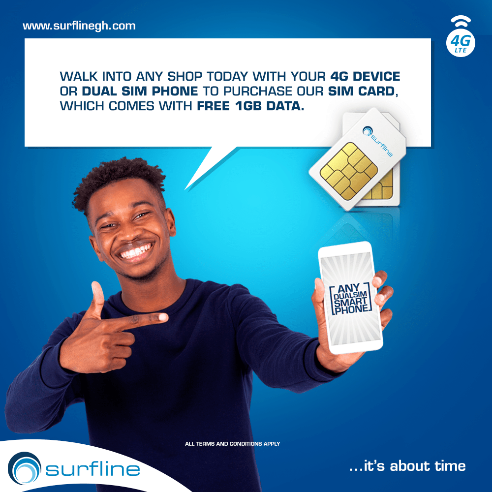 You can purchase a Surfline SIM card at any of the Surfline Flagship Stores in Accra and Tema for GHS 9.99 and get 1GB of free data.