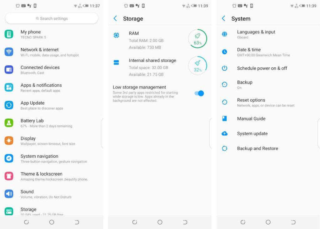 RAM and Storage on our review unit was 2GB and 32GB respectively. After installing most of the apps I use on a daly basis, there was 730MB of RAM remaining.