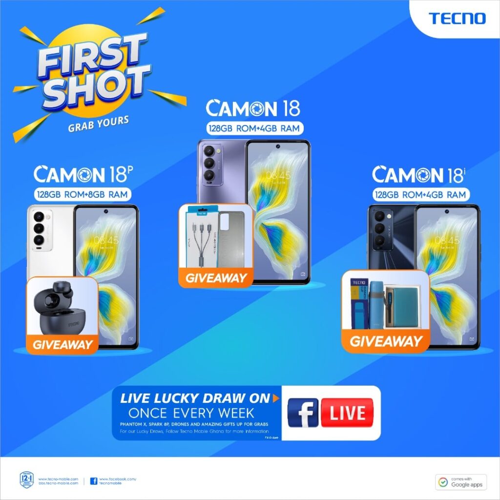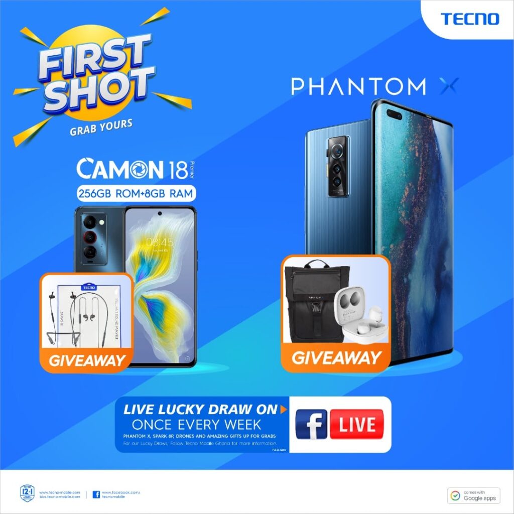 Purchases made during this period comes with a coupon and a chance to enter into the ‘FIRST SHOT’ lucky draw which will be live on TECNO Ghana’s facebook page, @TECNOMobileGhana. Participants stand the chance of winning PHANTOM X, SPARK 8P and a TECNO Drone.