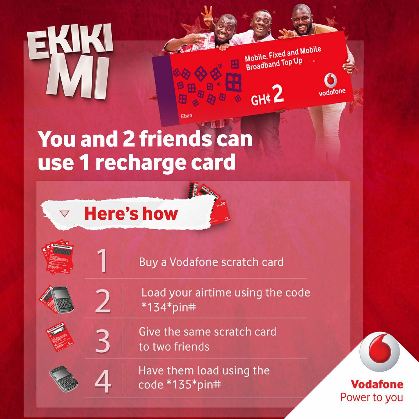 The Vodafone Ekiki mi Promotion, which was launched on 15th August 2017 is a credit multiplier service by Vodafone Ghana that allows 3 people to use one recharge card 3 times at the price of one. The first individual uses the credit by dialling *134# while the next two dial *135# to load.