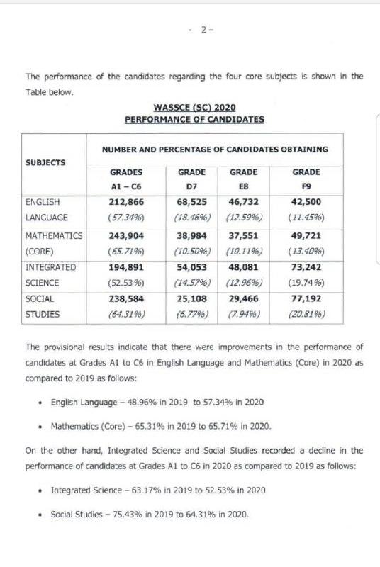 Below is a photo showing the 2020 WASSCE Performance for core subjects.
